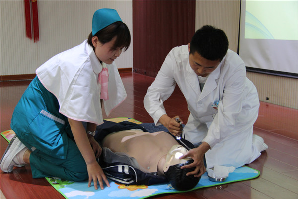 急诊科志愿者郑晨曦、许若楠为大家进行了基本急救技能--心肺复苏术和气管异物阻塞的演示,护生们积极性很高,纷纷上前练习。